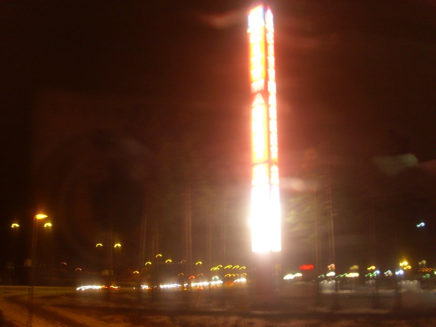 | "Suomalainen todellisuus. Materian totemi houkuttelee asiakkaita 1. adventtina". Keski-Suomi. Jyväskylä. Seppälä. City-Market. Kuva sunnuntaina 2008-11-30 klo 17:02 Maaseurakunnan hautausmaan suunnasta. Pertti Manninen. |