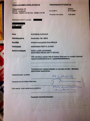 4.1.2012 Haastettu henkilökohtaisesti HAASTE RIKOSASIASSA Asiano: R 11/2681 Istunto Paikka Keski-Suomen käräjäoikeus Turvatarkastus Keski-Suomen käräjäoikeudessa on